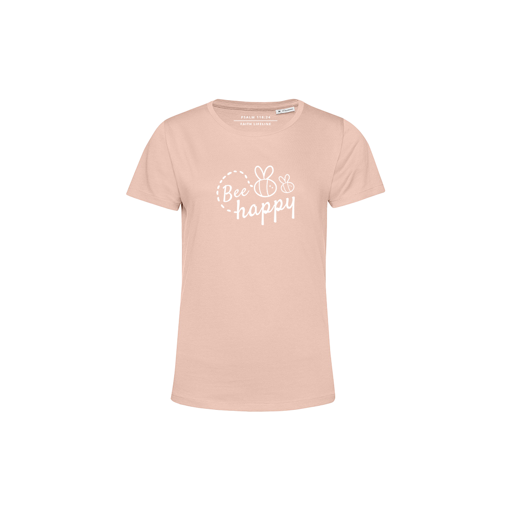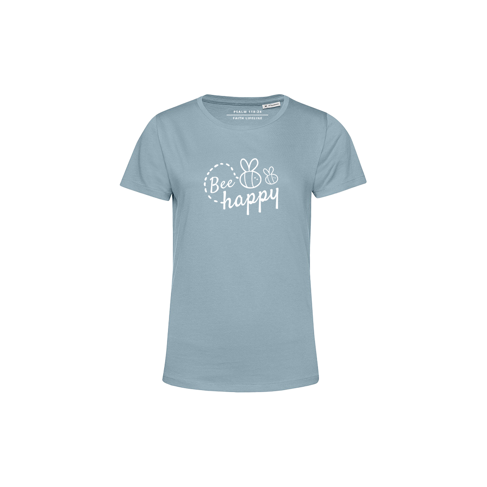 Duurzaam biologisch katoenen T-shirt met vrolijk en speels design van bijtjes in combinatie met de Engelse tekst: Wees Blij! Dit shirt is gebaseerd op de Bijbeltekst uit: Psalm 118:24 "Dit is de dag die de Heer heeft gemaakt, laten wij blij zijn en juichen!" Laten we samen een inspiratie zijn voor anderen, om ten alle tijden blij te mogen zijn.