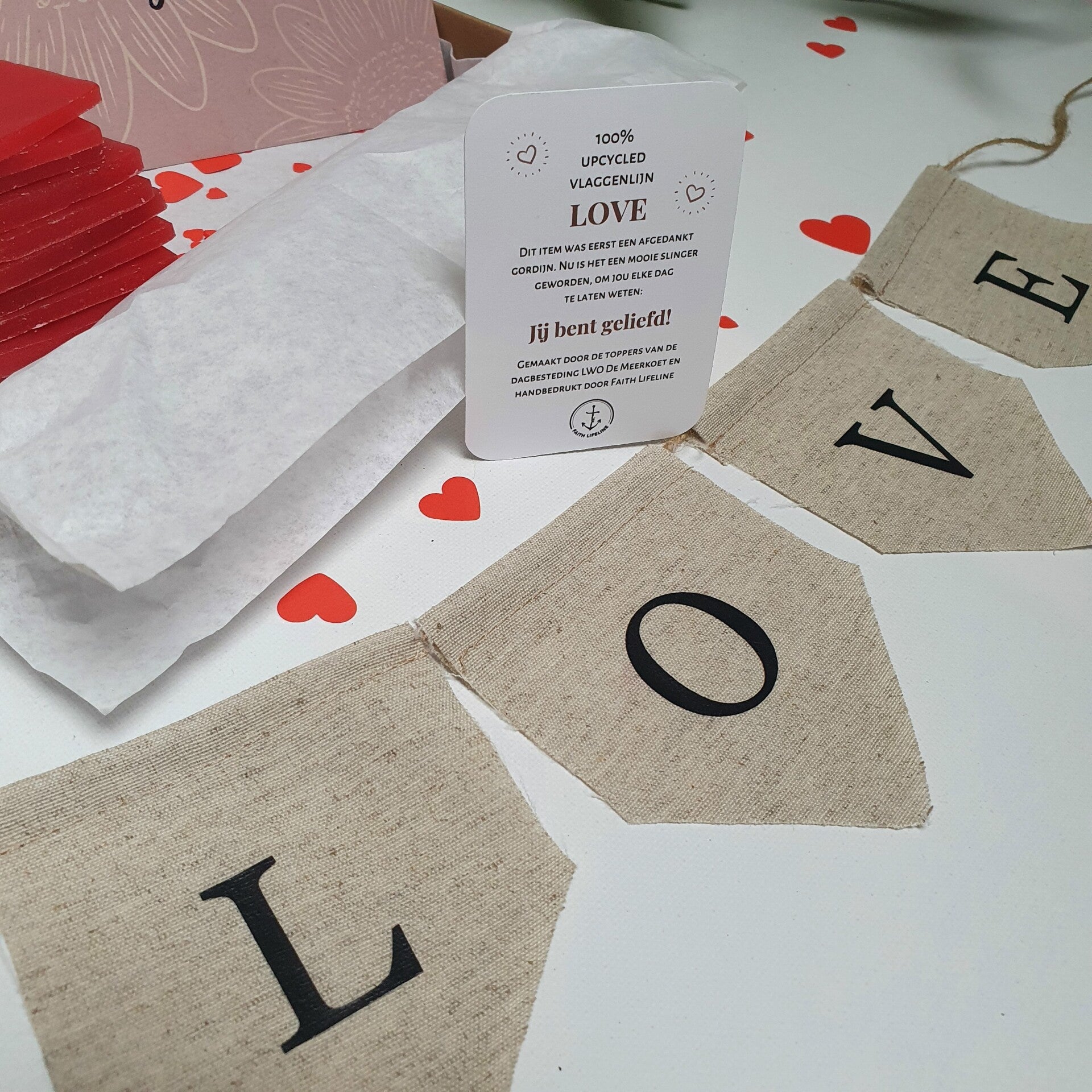 - Een slingerlijn met de letters LOVE. Eerst was het een afgedankt gordijn, maar ook dankzij Almirah, nu omgetoverd tot mooie neutrale vlaggen. Faith Lifeline heeft ze vervolgens met de hand bedrukt.