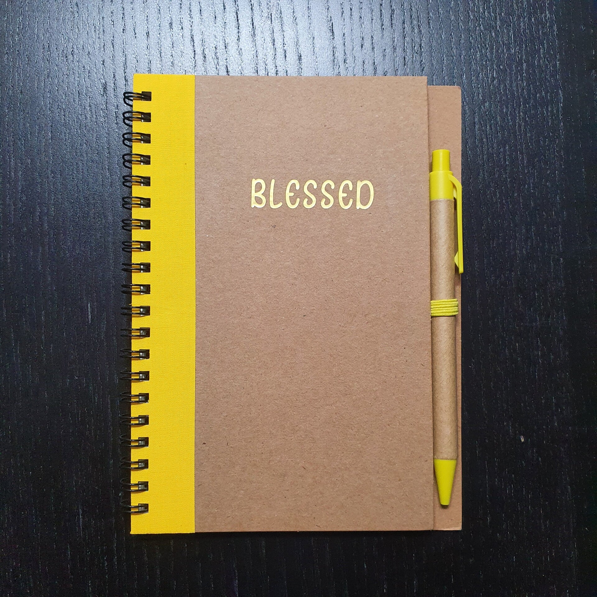 Eco Notebook "BLESSED" Made from recycled kraft & paper 60 lined pages Spiral Includes recycled kraft pen A5 format gold print