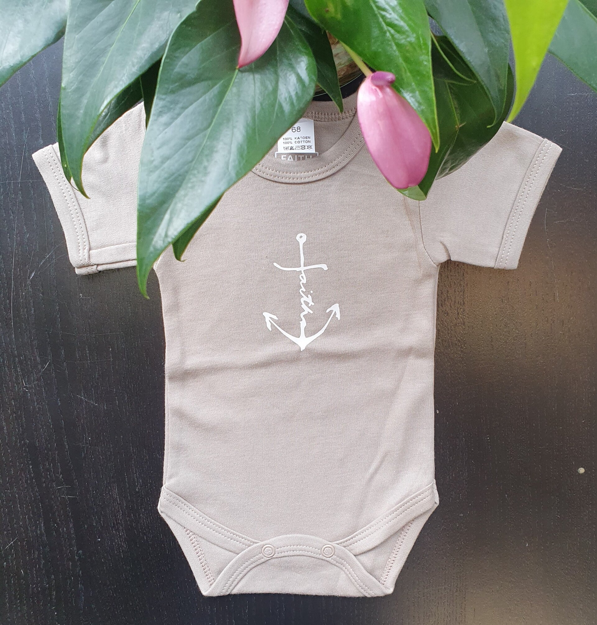 Khaki Romper met witte Faith Anker opdruk midden op de borst
