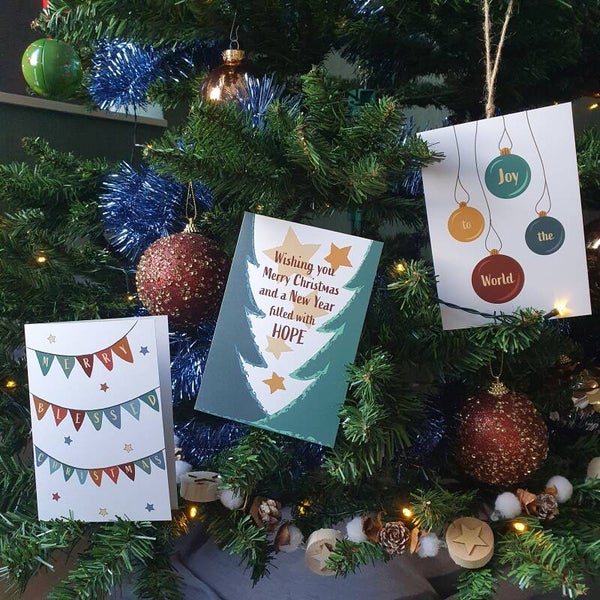 - Afbeeldingen van: kerstbomen en sterren met de tekst: Wishing you Merry Christmas and a New Year filled with HOPE.